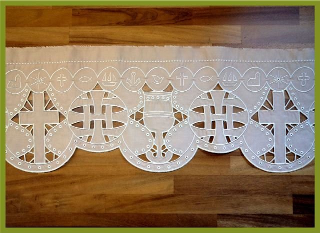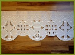 Her et udsnit af en maskinbroderet hulblonde til en alterdug